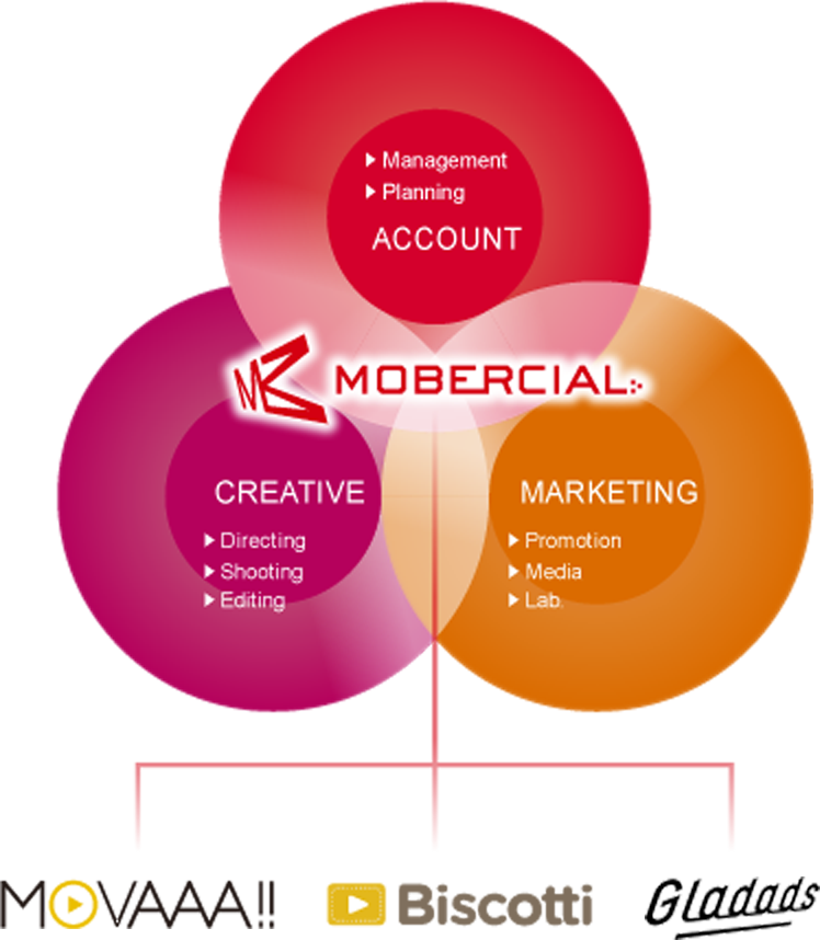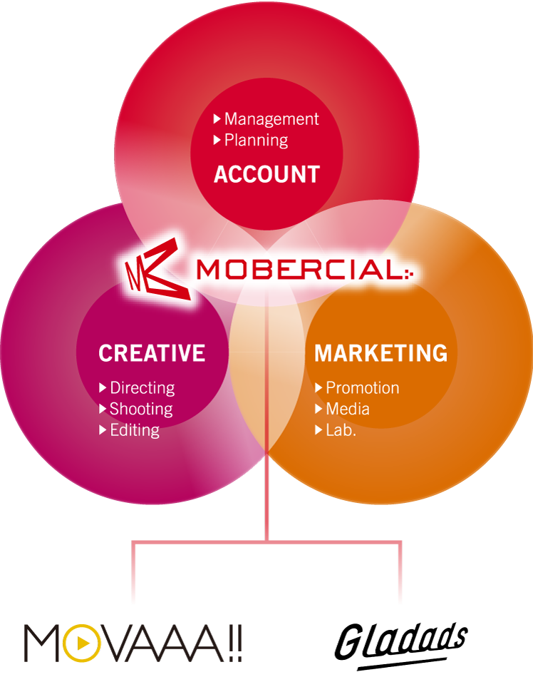 わたしたちは、「クリエイティブチーム」「マーケティングチーム」「アカウントチーム」という各動画のプロフェッショナルで組織しています。動画マーケティング専門のMOVAAA、エンターテイメント系Web動画プロダクションのBiscotti、動画広告専門のGladadsをグループに保有。動画を、ただつくるだけではなく、お客様のデジタルビデオマーケティング活動すべてを“フル・ハイクオリティ”で、成功に導くことをお約束します。
